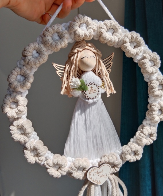 Szukasz wyjątkowego prezentu na komunię? Aniołek komunijny to doskonały wybór! Wykonany ze sznurka za pomocą precyzyjnych splotów, ten mały aniołek jest niezwykle delikatny i pięknie wykonany. Jego klasyczne kolory - biel i beż - sprawiają, że pasuje do każdego wnętrza oraz będzie idealnym dodatkiem do pamiątki z tego szczególnego dnia.