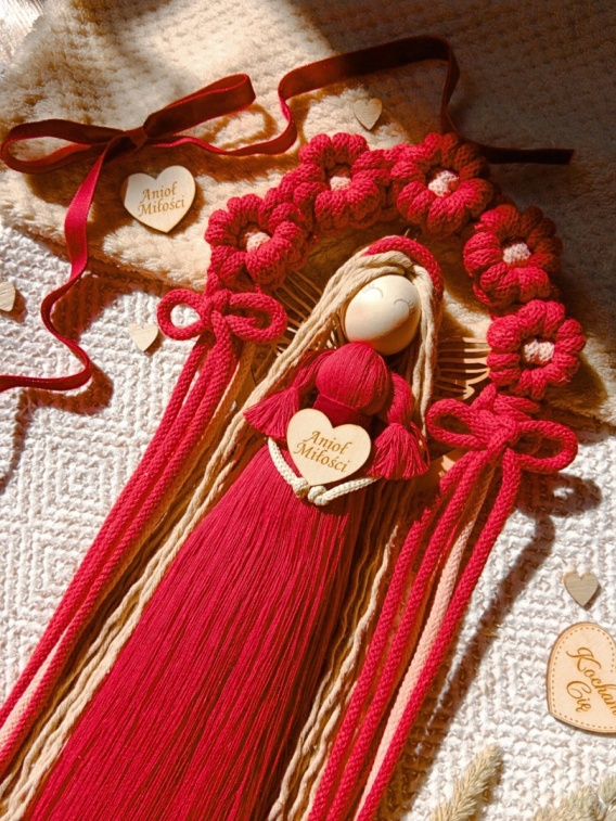 Anioł wykonany jest w odcieniach czerwieni, co od wieków stanowi królewki kolor- symbolizujący siłę, życiową energie, namiętność.
