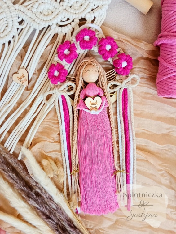 Aniołek Stróż w formie zawieszki na ścianę, to delikatny dodatek do dziecięcego pokoju. Anioł Stróż w kolorach różu- pastelowy róż, fuksja, jasny beż.