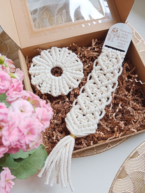 Zakładka oraz podkładka zapakowane są w ozdobne pudełko z okienkiem, przewiązane wstążką. Box jest gotowy do wręczenia. Wymiar pudełka 20,5x22,5