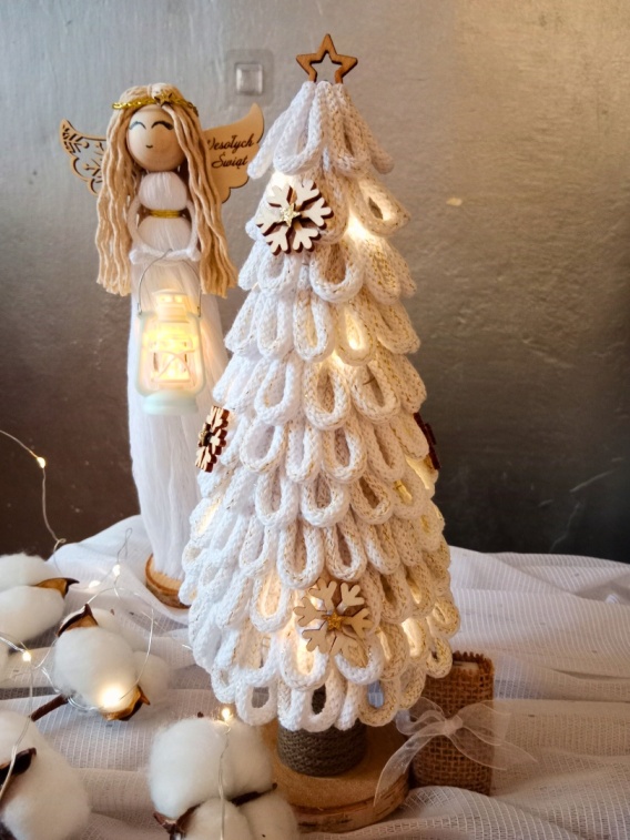 Stojąca choinka z białego bawełnianego sznurka ze złotą nitką na brązowym pniu z dodatkiem drewnianych gwiazdek ze złotym środkiem.