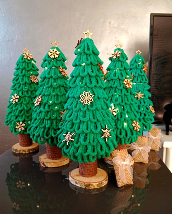 Choinka umieszczona jest na drewnianym krążku. W zestawie znajnują sie zamontowane lamkpi led z baterią.